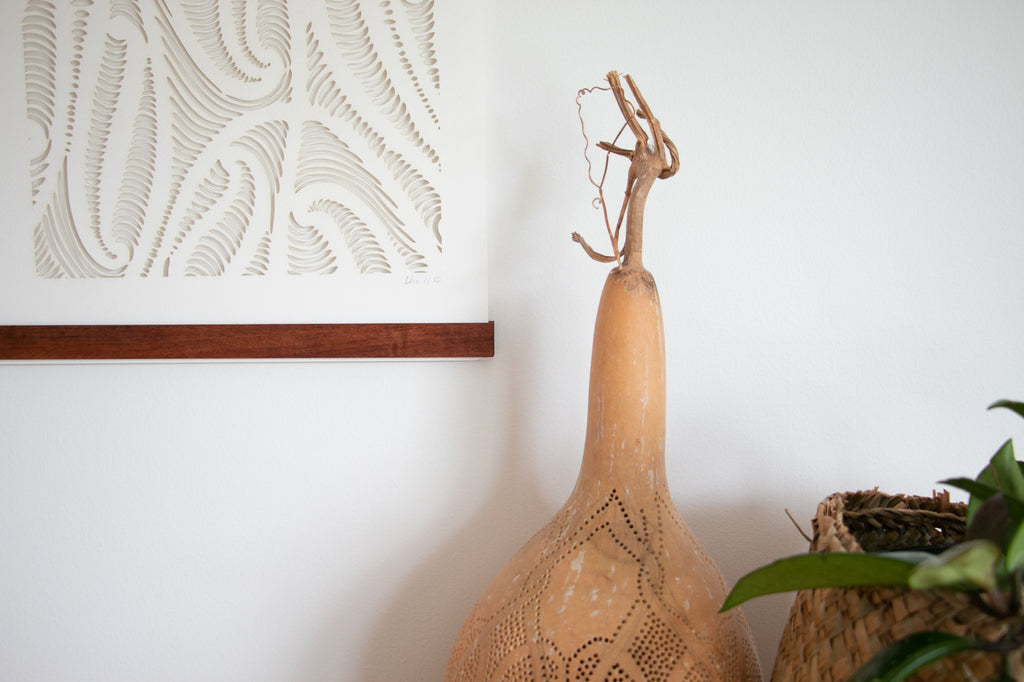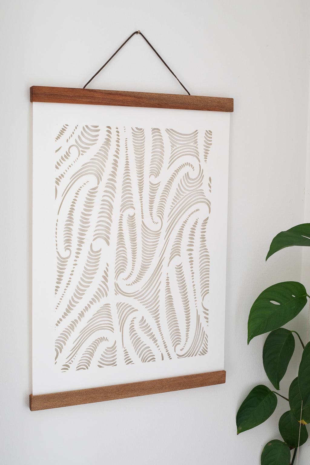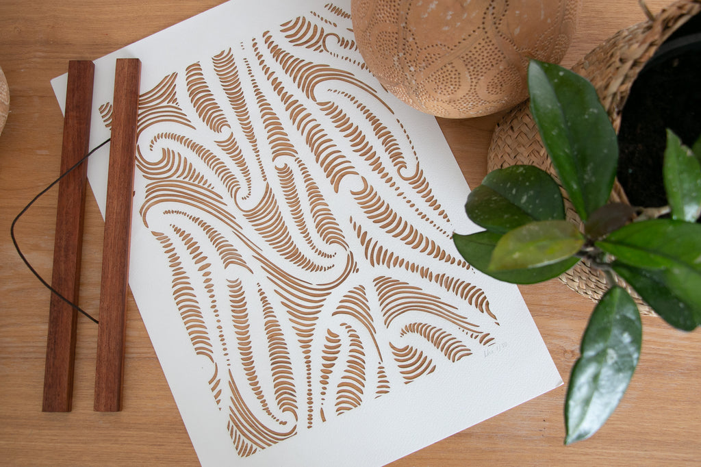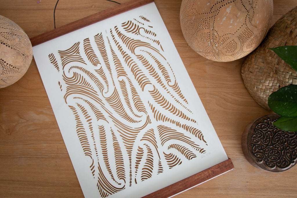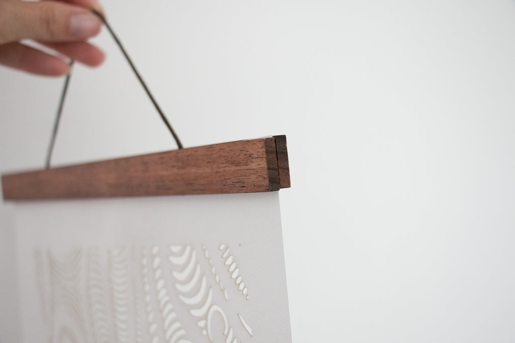 If you purchase without the hanger, we've found that a floating mount is a beautiful way to present these paper cuts so as to maintain the shadow/ light play of white-on-white.