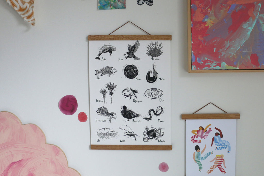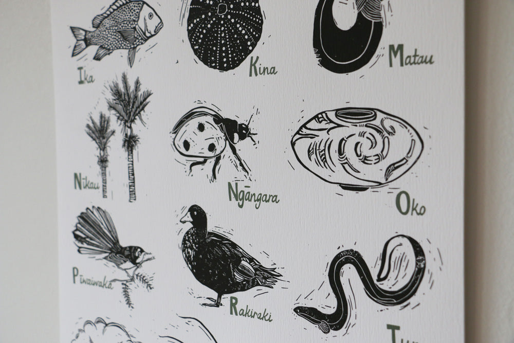 With a hand carved illustrations from A to Wh, this te ao māori inspired alphabet poster is just as much for tamariki as their mātua (parents) to enjoy.