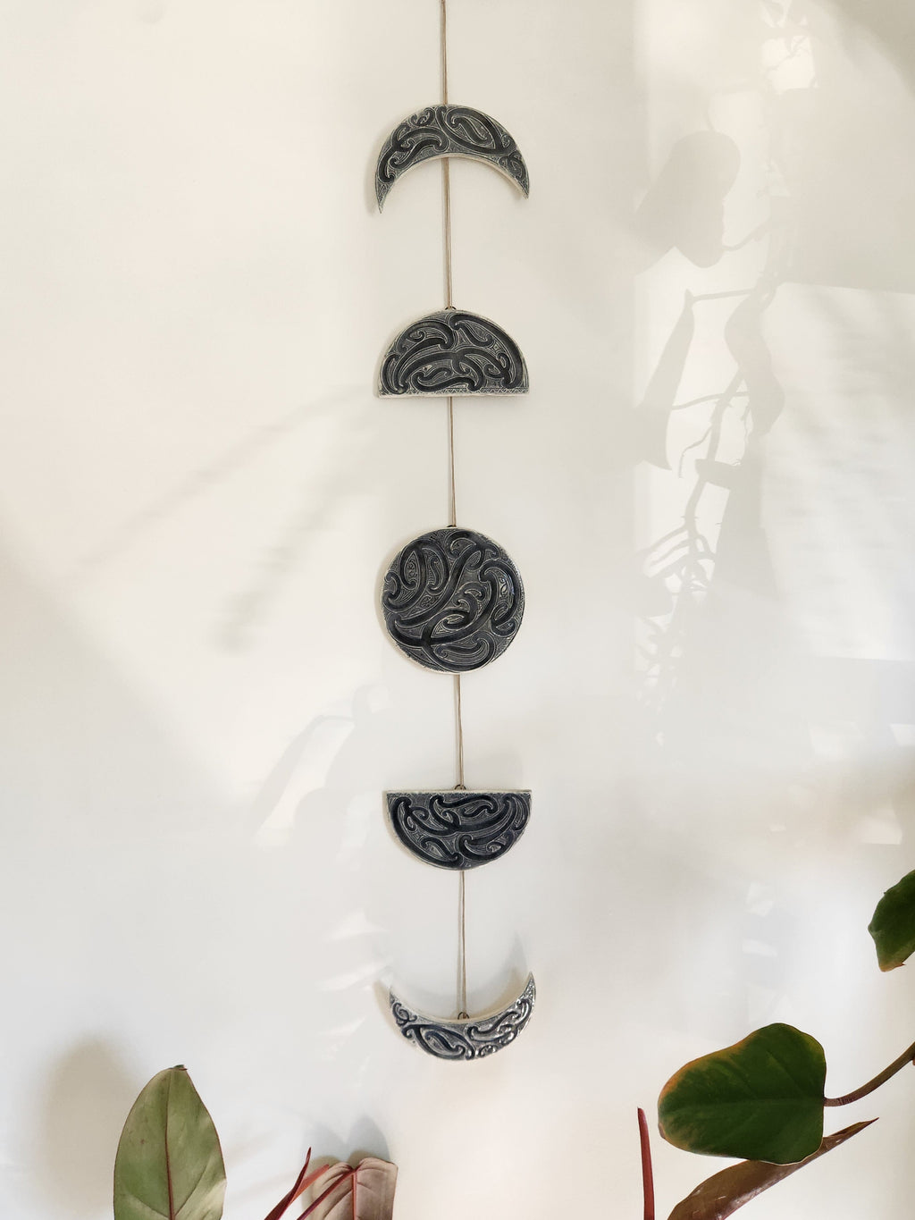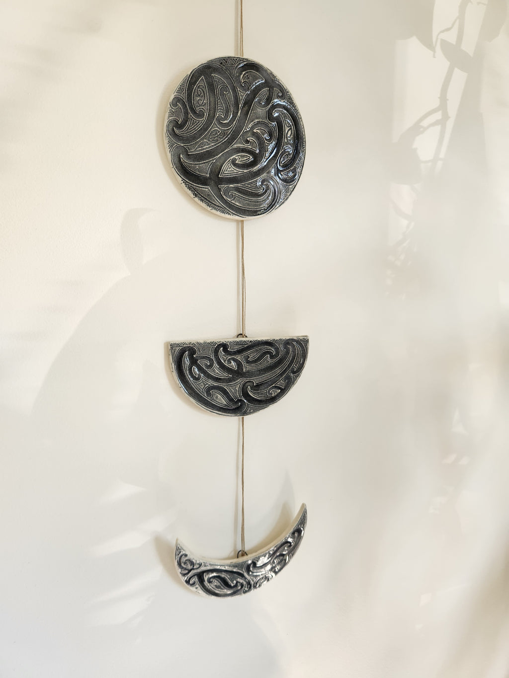 Each set of mata is strung on linen thread and handmade in our Taranaki studio from clay, then glazed. A set includes five phases of the marama, and when hung measures approximately 78 cm in length. The full marama has a diameter of approximately 11 cm. This listing is for Black on White.