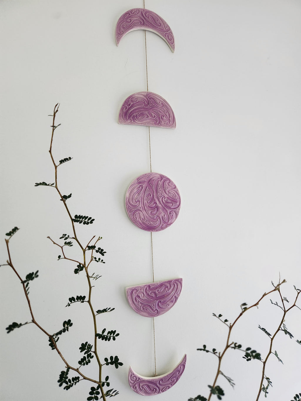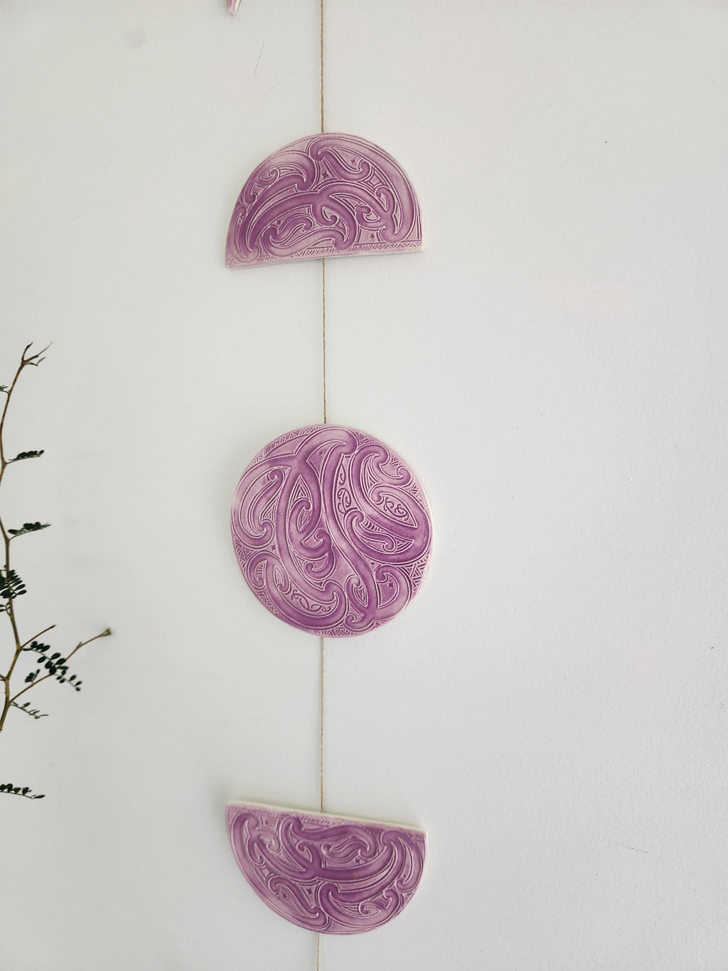 Each set of mata is strung on linen thread and handmade in our Taranaki studio from clay, then glazed. A set includes five phases of the marama, and when hung measures approximately 78 cm in length. The full marama has a diameter of approximately 11 cm. This listing is for Lilac Glaze on White Clay.
