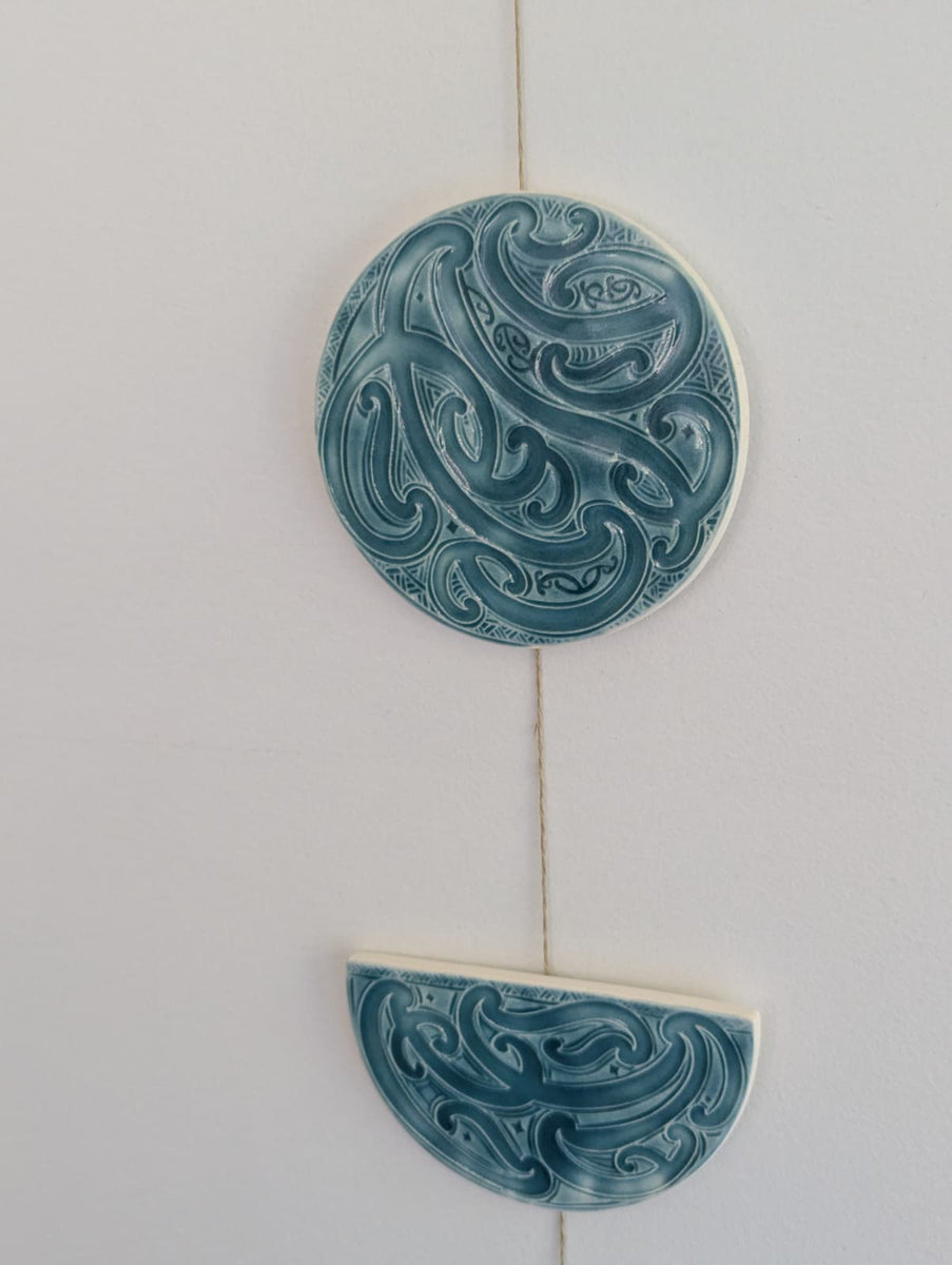Each set of mata is strung on linen thread and handmade in our Taranaki studio from clay, then glazed. A set includes five phases of the marama, and when hung measures approximately 78 cm in length. The full marama has a diameter of approximately 11 cm. This listing is for Turquoise on White Clay.
