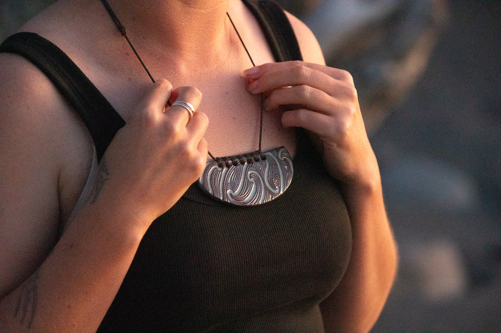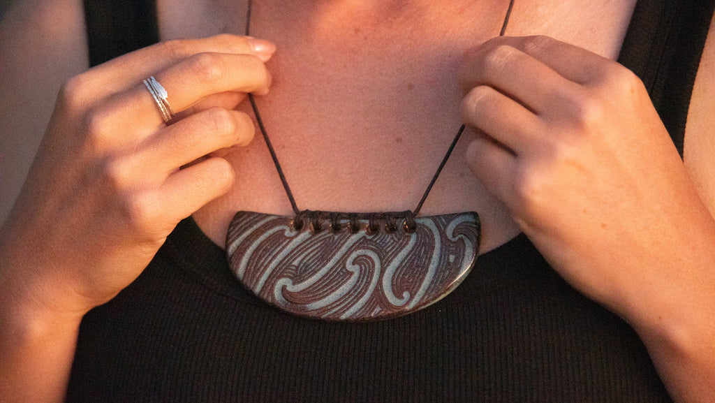 Each taonga is made from uku - clay in our Taranaki based studio. We create custom designs which are impressed into the uku, before being formed and refined into pendants. Once the clay is completely dry, it is bisque fired in our kiln at 1200 degrees, turning the once malleable uku to a hard and brittle material.  From here, we sand and refine before glazing in our Aho glazes. The whakakai then returns to the kiln for the final glaze firing where the glaze turns from a powdery layer into a glass. Once glazed, we bind them with 100% cotton waxed cord with an adjustable slip knot to style at your own length and preference.