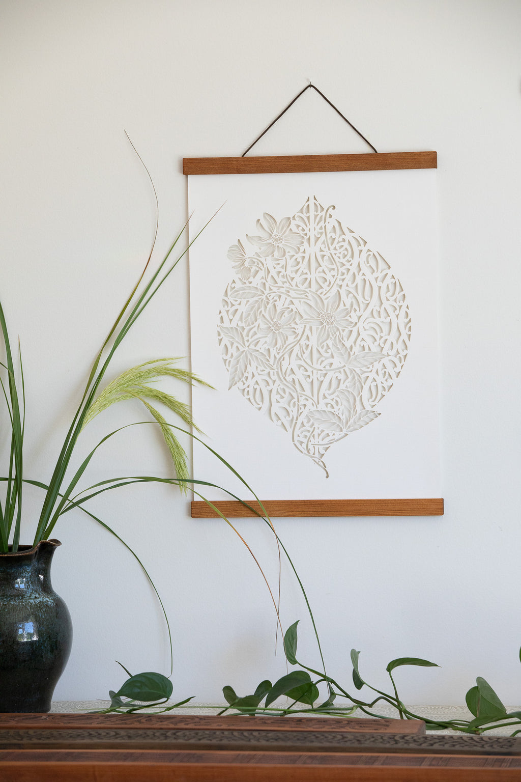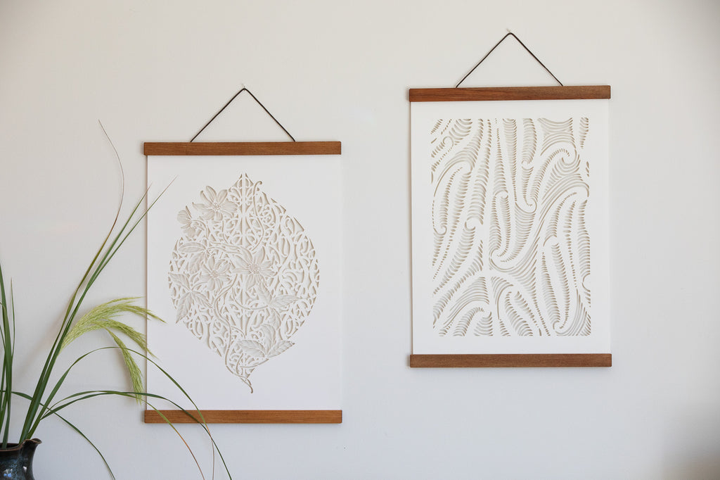 If you purchase without the hanger, we've found that a floating mount is a beautiful way to present these paper cuts so as to maintain the shadow/ light play of white-on-white.