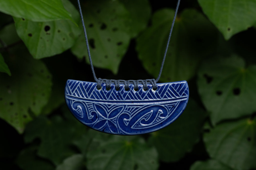 Each taonga is made from uku - clay in our Taranaki based studio. We create custom designs which are impressed into the uku, before being formed and refined into pendants. Once the clay is completely dry, it is bisque fired in our kiln at 1200 degrees, turning the once malleable uku to a hard and brittle material. From here, we sand and refine before glazing in our Aho glazes. The whakakai then returns to the kiln for the final glaze firing where the glaze turns from a powdery layer into a glass. Once glazed, we bind them with 100% cotton waxed cord with an adjustable slip knot to style at your own length and preference.